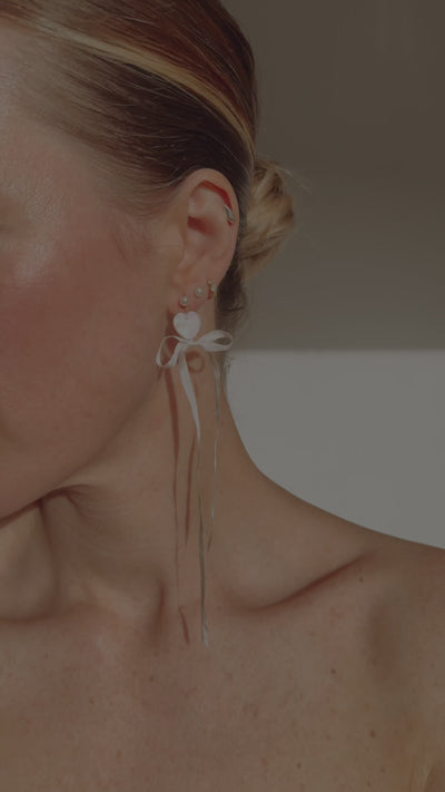 Beautiful mother of pearl hearts with dainty pure silk bows in natural, un-dyed lightest ivory and finished off with a freshwater pearl at the ear.